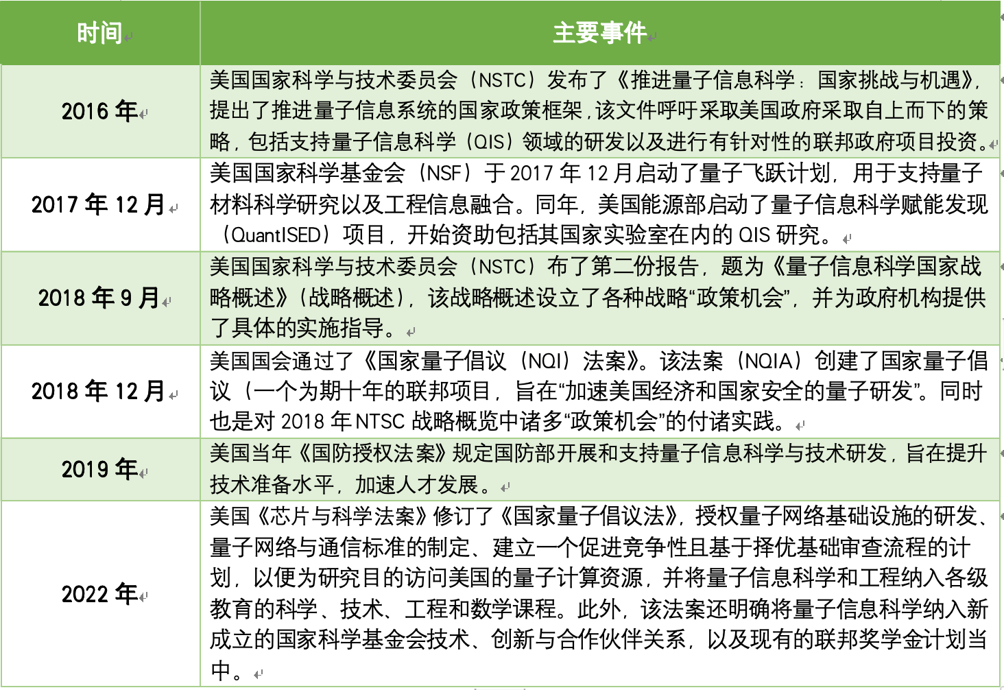 美国政府及下属相关机构对量子技术,纳米技术在内的先进技术一直比较重视,下表以时间线方式梳理了美国政府在量子信息科学(简称QIS)方面的政策。