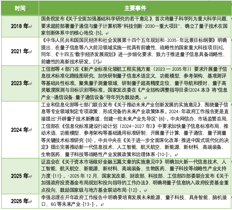 我国政府对量子技术高度重视,量子科技作为未来产业之一,已经累计7次出现在我国政府年度工作报告之中。我国已将量子技术从“前沿探索”正式升级为“国家战略必争领域”,肯定和明确了量子科技作为新质生产力关键动力引擎之一。下表以时间线方式梳理了我国政府在量子科技方面的相关政策。