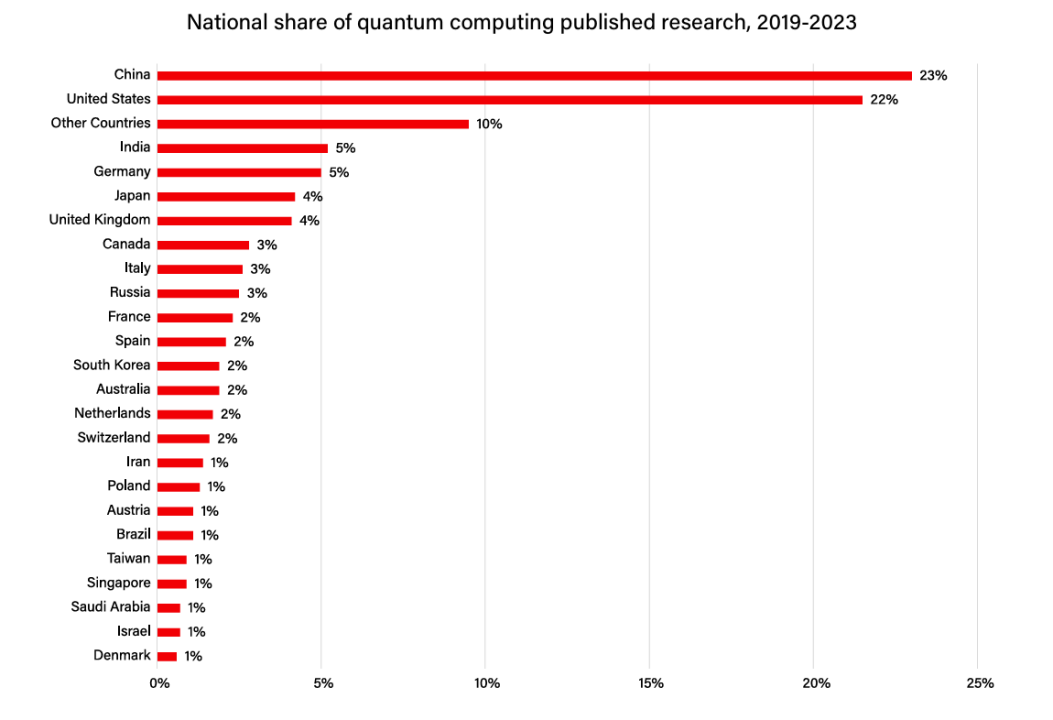 根据对2019年到2023年对全球量子计算论文等出版物的统计显示,中美两国发表的出版物合计占所有出版物的进一半,其中中国占比23%,美国占比22%,印度5%名列第3名。这表明在全球量子计算研究产出中,中美两国投入了更多的资源并产出了更多的成果。