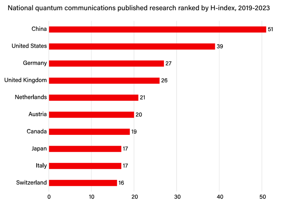 图:世界各国量子通信出版物H指数排名(2019-2023)[19]