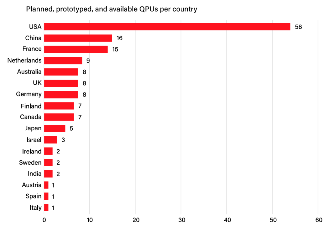 针对量子处理器,世界各主要发达国家正在参与一场实现高性能量子处理单元(QPU)的战略竞赛。截至2024年,全球商业可用的QPU数量约为40台,来自二十多家制造商。这场竞赛暂时由美国领先,美国拥有最多数量的QPU和最多样的类型(共计16款)。中国、芬兰和荷兰并列第二位(各计4款),美方学术观点认为排名后面这些国家的商业QPU性能较低,规模也小于美国。