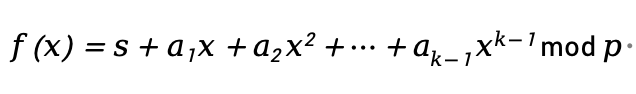 秘密共享方案采用Shamir门限秘密共享机制,将秘密s分解为n个份额,只需k个份额即可恢复秘密,但少于k个份额无法获得任何信息。其数学表达式为: