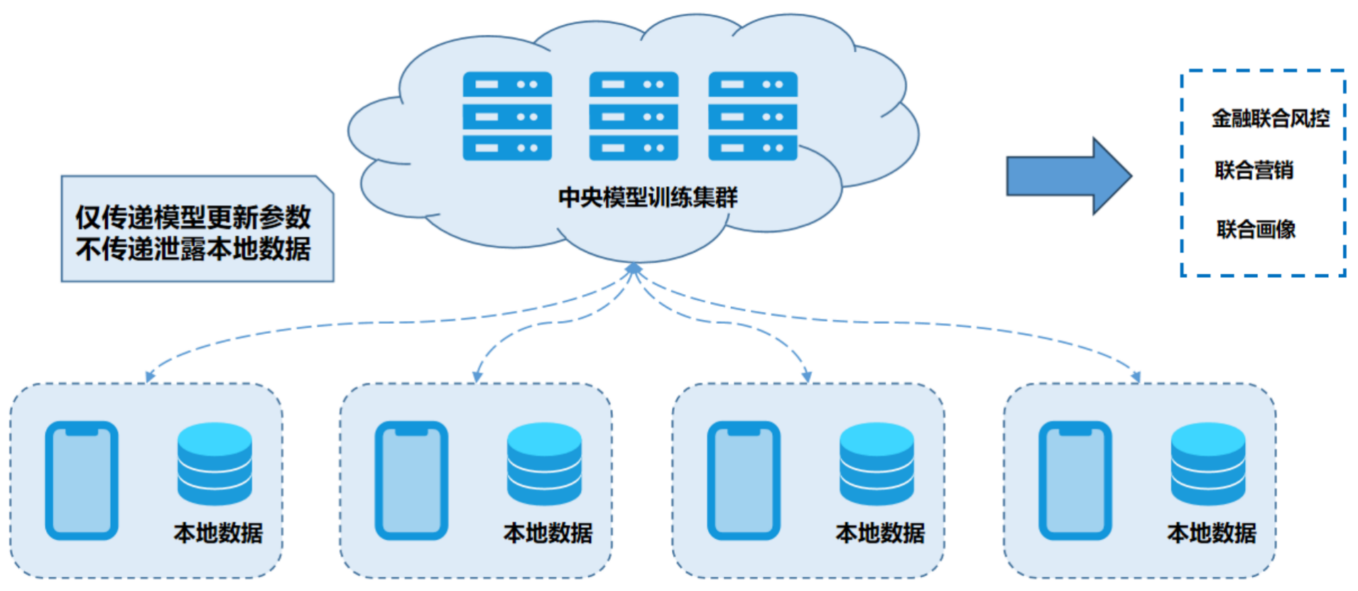 联邦学习通过"数据不动,模型动"的方式,在本地训练模型并仅交换模型参数实现协同建模。安全聚合机制采用双重掩码技术: