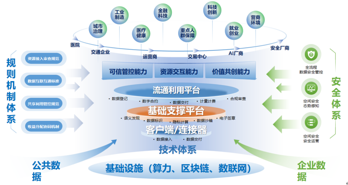 l 基础设施层:依托隐私计算(如联邦学习、多方安全计算、可信执行环境)、区块链、数据沙箱等技术,构建“原始数据不出域、计算结果可验证”的安全底座;