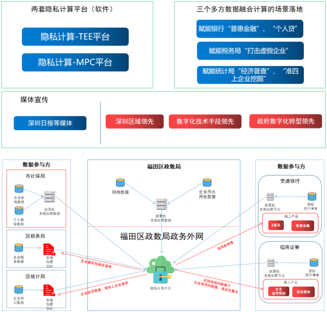 深圳市福田区政务服务数据管理局(政数局)建设了包含MPC和TEE两套引擎的隐私计算平台,打造了城市级可信数据空间的典范。该平台实现了三大核心价值: